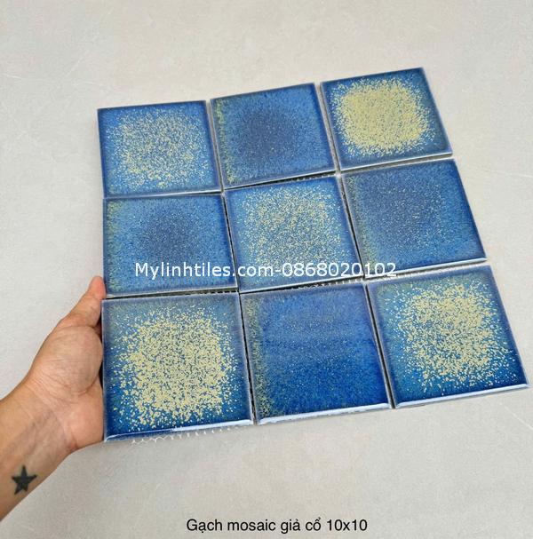 Gạch mosaic 10x10 men rạn màu xanh nhũ vàng