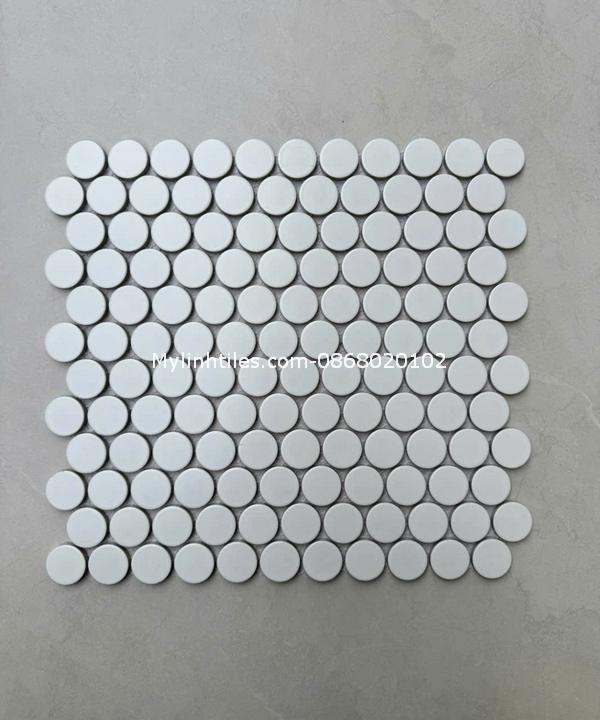 Gạch mosaic chấm bi màu trắng được tạo nên từ những viên gạch nhỏ li ti có hình tròn, được ghép lại với nhau tạo thành một tổng thể hài hòa và tinh tế. Màu trắng tinh khiết mang đến cảm giác tươi mới, rộng rãi và sang trọng cho không gian.