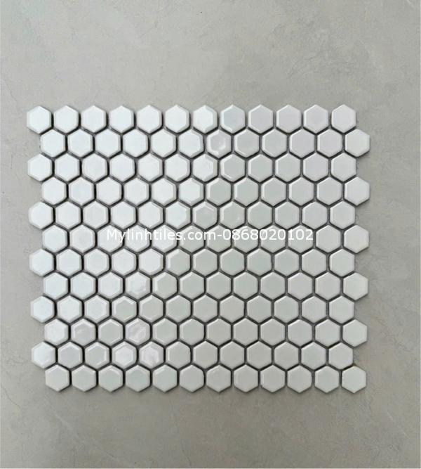 - Thiết kế hiện đại, sang trọng: Gạch mosaic lục giác với màu trắng tinh khôi, men mờ tạo nên vẻ đẹp tinh tế, phù hợp với nhiều không gian khác nhau.