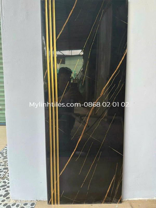 Gạch ốp cầu thang 47x120 đen vân nhũ vàng nhập khẩu